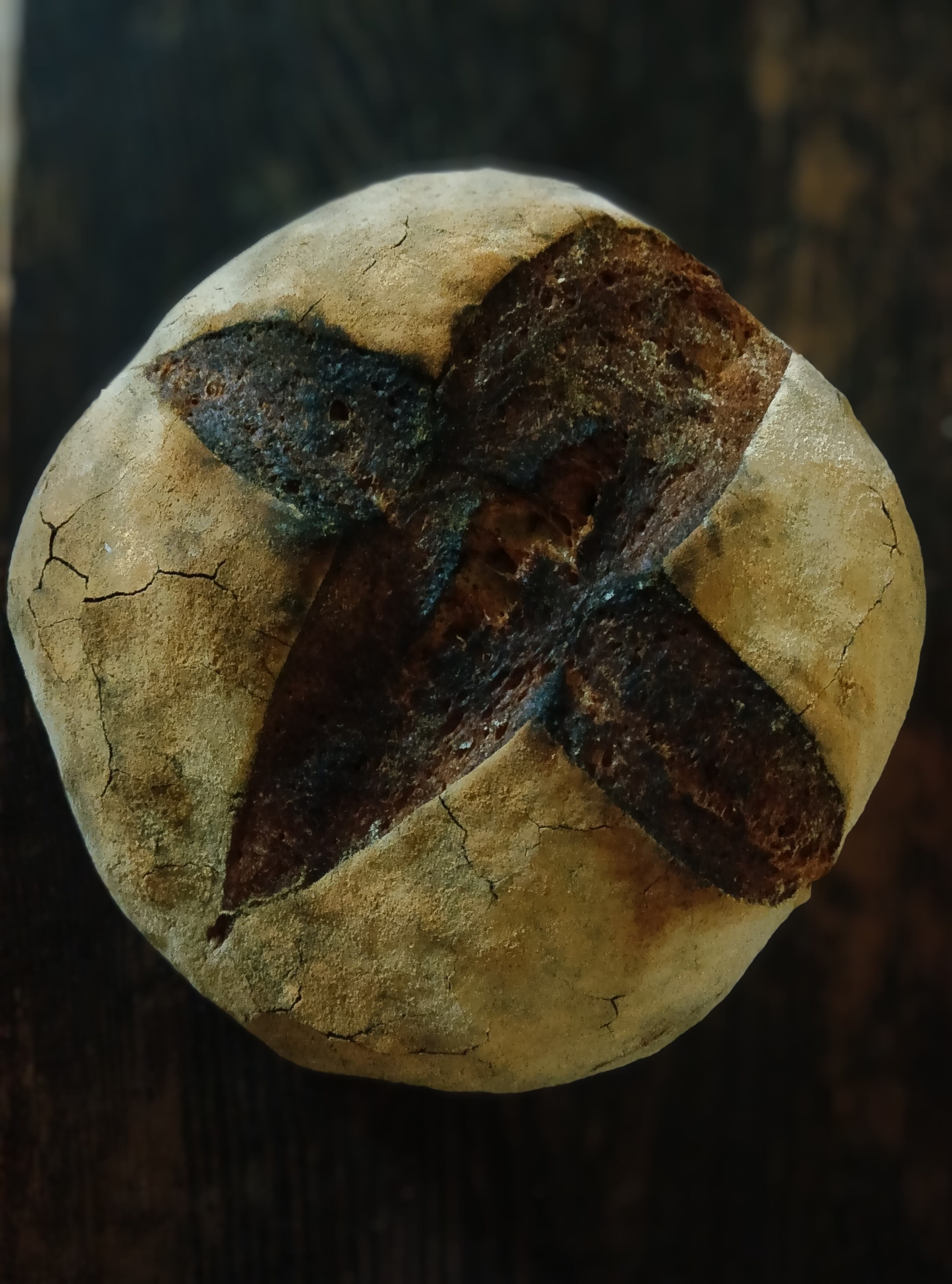 長野県産有機全粒粉、長野県産無農薬古代小麦、無農薬ライ麦を使用しています。酵母には有機焙じ茶を発酵させた自家製酵母を使用、こちらのパンには水ではなく加賀の有機焙じ茶を使用しています。