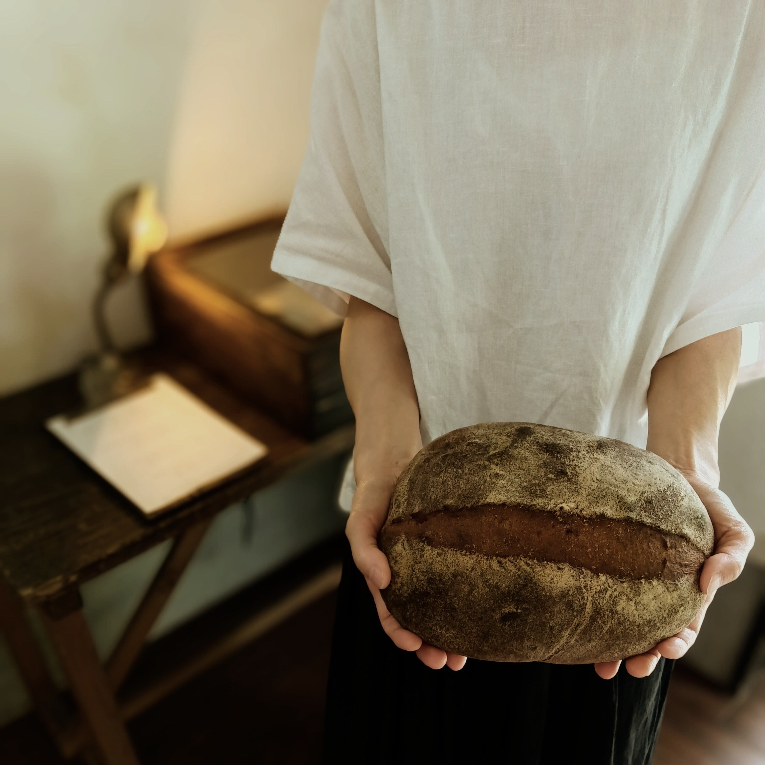 農夫が疲れた身体でブリオッシュを一口、ほんのりとした甘さと小麦の香りが疲れた身体を癒やしてくれる、そんなイメージのパン